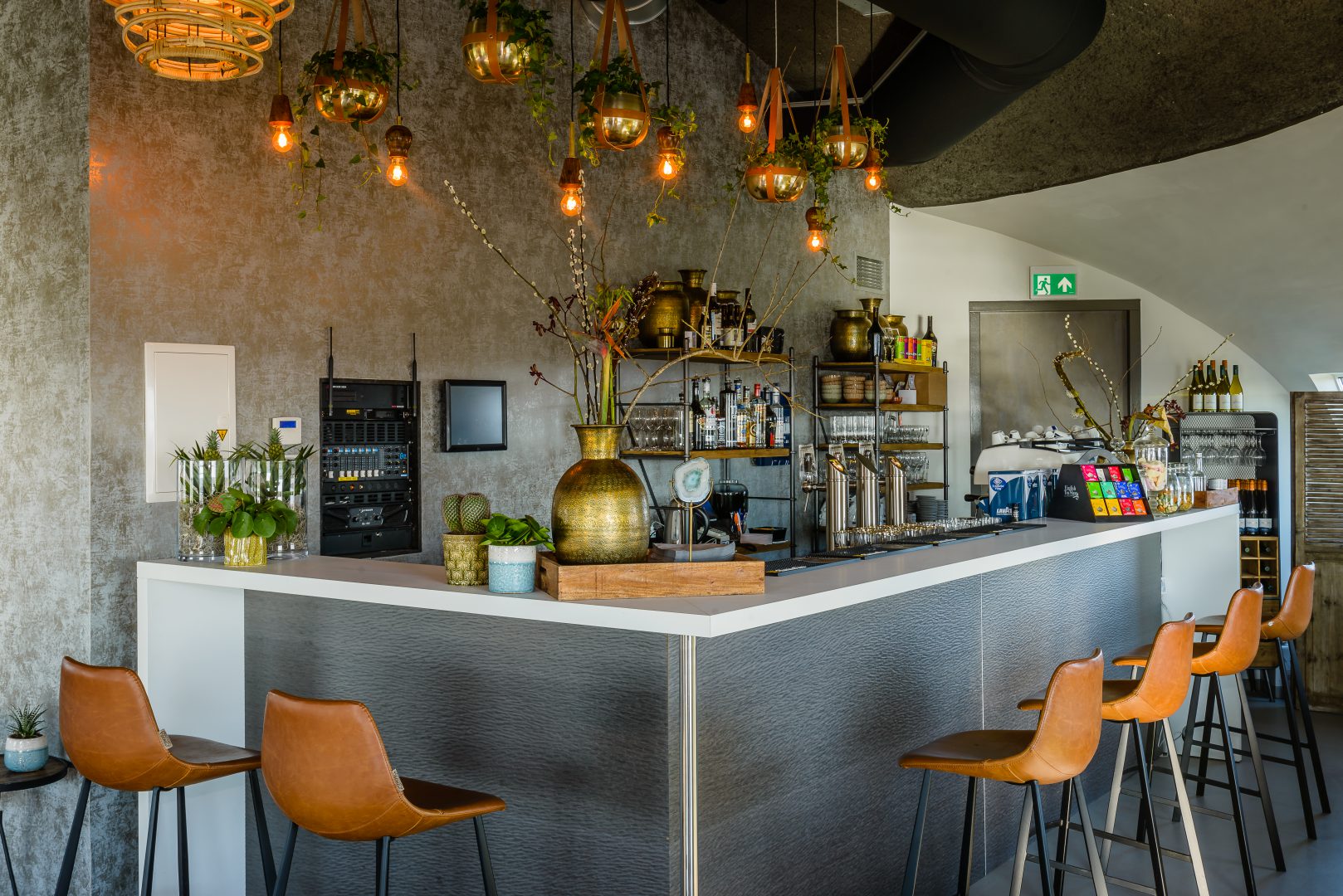 En dan heb je uiteindelijk een kantoorlocatie met karakter; prachtig uitzicht en de perfecte plek voor de vrijdagmiddagborrel: het restaurant op de bovenste verdieping!